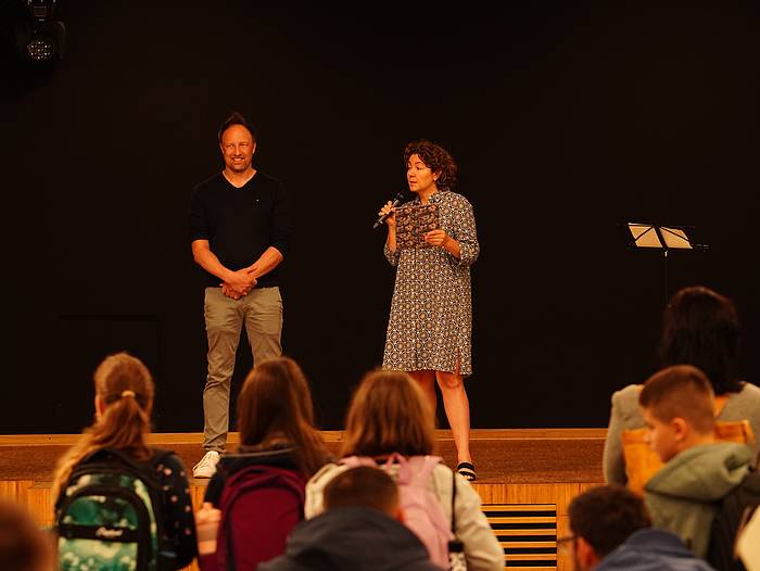 Zum Auftakt der Veranstaltung spielten die Lehrkräfte Mirjam Schuster und Bastian Bartel ein Duett für zwei Trompeten. Darauf folgte die Begrüßung durch die Schulleitung Claudia Gaßner und Patrick Hahn.