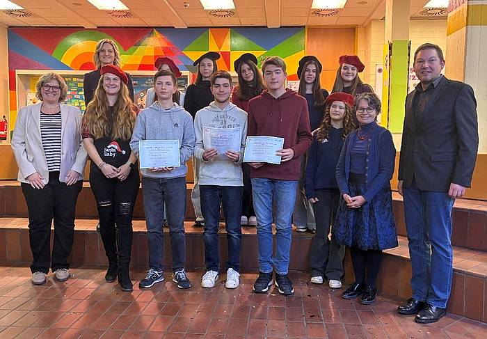 Schulleiterin Sabine Hoffrichter zeigte sich sowohl von der Ehrung selbst als auch von der kreativen Präsentation der Schülerinnen und Schüler der Klassen 7c, 8c und 5a begeistert. Schülerinnen und Schüler der 8c hatten einen französischen Sketch unter der Leitung von Frau Studienrätin Lisa Wolpert einstudiert und die Klasse 5a trug unter der Leitung von Frau Studienrätin Cornelia Heckendorff ein französisches Lied vor.