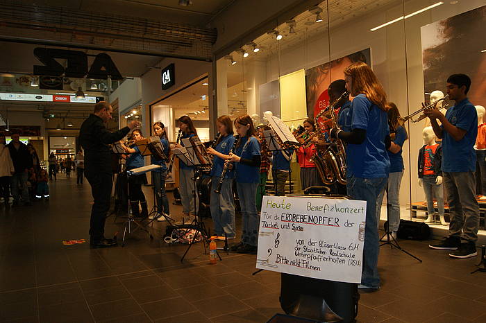 Mit zwei Benefizkonzerten der Bläserklassen in den „Germeringer Einkaufs-Passagen“ und in den „Pasing Arcaden“, mit dem Verkauf von selbstgebackenen Kuchen in den Pausen und mit einer Spendenbox für Groß- und Kleinspenden wurde in dieser Woche mit Feuereifer und großartigem Einsatz Geld gesammelt.