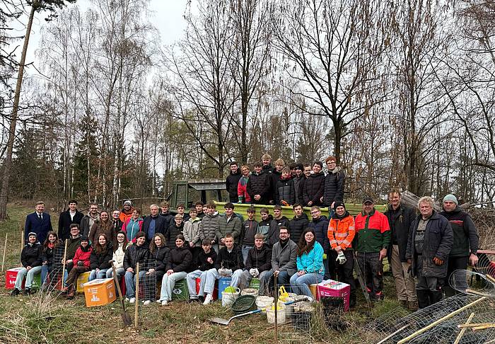 Mit großem Engagement und viel Tatkraft beteiligten sich am Montag, 13. April 2026, die Klassen 8b und 9b der Realschule Hof gemeinsam mit ihren Lehrerinnen Frau Fritsche, Frau Masi und Frau Renofio-Quatram sowie dem Studienseminar an einer Baumpflanzaktion im Wald bei Kautendorf. Bereits zum zweiten Mal wurde damit ein starkes Zeichen für den Klimaschutz gesetzt und das erfolgreiche Projekt „Waldumbau“ fortgeführt.