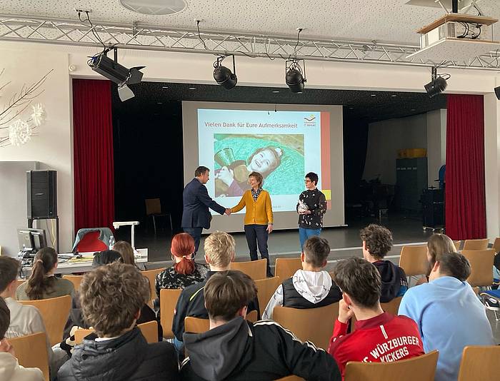 Zum Abschluss des Vortrags überreichte Schulleiter Florian Klemm eine Spende in Höhe von 415 Euro an Elfriede Notz. Er betonte: "Mit dieser Spende möchten wir unsere Anerkennung ausdrücken und zumindest einen kleinen Beitrag leisten, damit das Kinderhospiz St. Nikolaus weiterhin ein Ort voller Leben sein kann. Vielen Dank an alle, die diese Spendenaktion möglich gemacht haben." Denn das Geld wurde beim Tag der offenen Tür durch einen Kuchenverkauf gesammelt, den die Religionslehrerinnen Nicola Hosp und Isabell Thiem gemeinsam mit den 9. Klassen organisiert hatten.