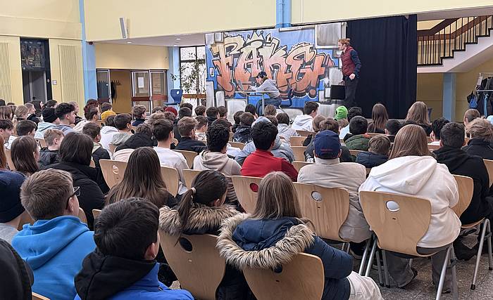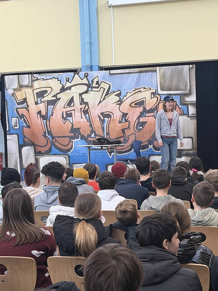 Am 14. Januar 2026 fand an der Hermann-Stamm-Realschule Schwabach für alle Schülerinnen und Schüler der 7. Jahrgangsstufe eine besondere Präventionsveranstaltung statt: Das mobile Theaterstück mit dem Titel „Fake oder war doch nur Spaß“, welches vom Berliner Ensemble Radiks aufgeführt wurde, machte eindrucksvoll auf die Gefahren von Cybermobbing und den verantwortungsvollen Umgang mit digitalen Medien aufmerksam.