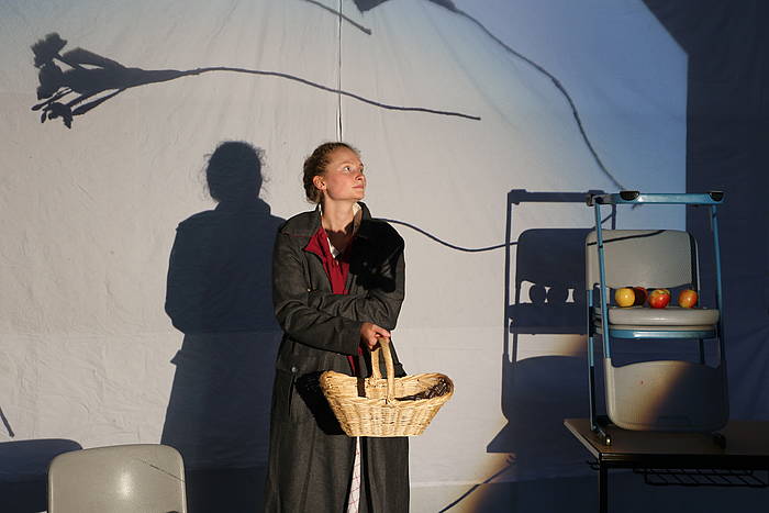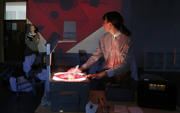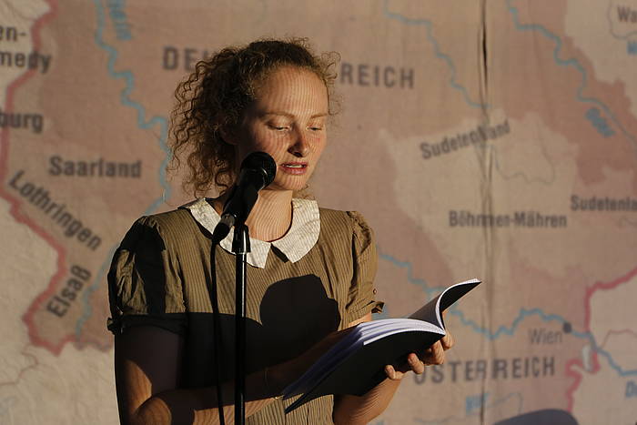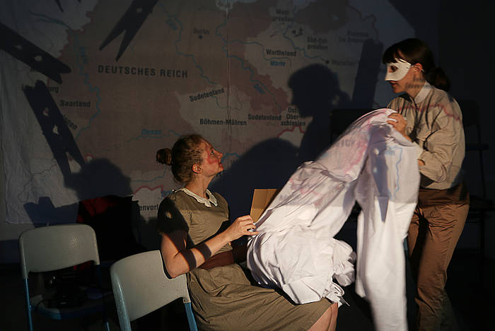 Ein altes Kofferradio, ein Overhead-Projektor, ein Berg aus Stühlen – weiße Laken darüber geworfen. Inmitten dieser Kulisse steht Julia Höhfeld, vor ihr ein Mikrofon. „Das ist das Buch meiner Oma. Lies bitte ab Seite 4.“, sagt ihre Kollegin Janina Sachsenmaier und übergibt Höhfeld ein schwarzes Büchlein: „Unsere Kindheit in Danzig war sehr schön.“, beginnt diese das Kapitel. Vor den beiden sitzen Schülerinnen und Schüler der 10. Jahrgangsstufe und hören aufmerksam zu. Sie beobachten, wie die beiden Spielerinnen im Verlauf der Stunde ihr Klassenzimmer in einen Bühnenraum verwandeln, wie sich aus Livelesungen, Audiointerviews, Spielszenen, Lichtinstallationen und Klangkulissen mosaikartig eine Ge-schichte entspinnt: Die Biografie von Sachsenmaiers Großmutter, die 1945 wie Millionen andere aus den ehemaligen deutschen Ostgebieten floh. Die Klasse erfährt vom Bund Deutscher Mädel, vom Potsdamer Abkommen und vom Jazz im neuen, zerbombten Deutschland. Dabei hört sie in Auszügen die Originalstimme der 92-jährigen Großmutter, die ihrer Enkelin die eigene Lebensgeschichte erzählt.