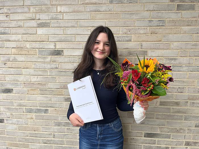 Für ihre exzellenten Leistungen wurde Karla Voglmeier nun eigens geehrt, da sie mit ihrer Punktezahl das beste Ergebnis im MB-Aufsichtsbezirk (München Stadt und Land) erzielt hat. Auch bayernweit gehörte sie mit ihrer Leistung zu den besten Teilnehmenden. Im Zuge der Ehrung hob Frau Kalisch das Ergebnis eigens hervor und gratulierte ihr recht herzlich für das herausragende Ergebnis. Geehrt wurde die Schülerin mit einer besonderen Urkunde des Cambridge Instituts, einem Strauß Blumen und einem Büchergutschein, über den sich Karla besonders freute. „Diesen werde ich gleich für ein neues Englischbuch verwenden“, war sie sich sicher.