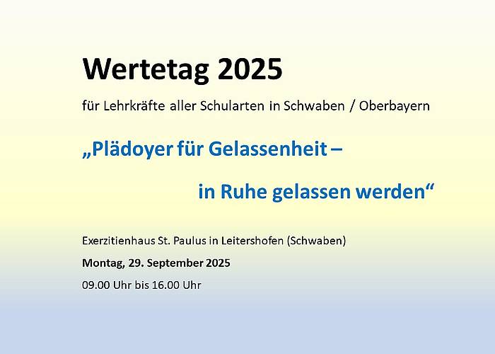 Unter dem Motto "Plädoyer für Gelassenheit - in Ruhe gelassen werden" findet der schulartübergreifende Wertetag der Regierungsbezirke Schwaben und Oberbayern im Jahr 2025 statt.