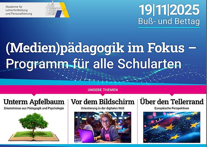 Digitale Fortbildungsangebote für den Pädagogischen Tag: Der Anhang enthält den Flyer der Stabsstelle ALP Dillingen für den diesjährigen Buß- und Bettag (19.11.2025) unter dem Motto „(Medien)pädagogik im Fokus“.