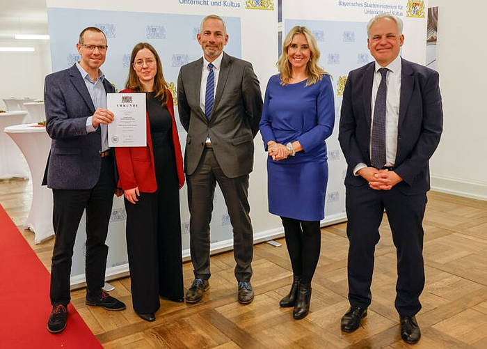 v.r.n.l.: Christian Ceglarek, Ministerialbeauftragter für die Realschulen in Niederbayern, Anna Stolz, Kultusministerin, Stefan Renner, Schulleiter, Julia Weber, Staatl. Schulpsychologin, Ulrich Rummel, stellv. Schulleiter