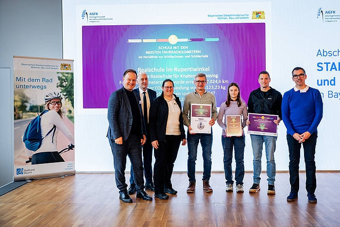 Umso größer war die Freude, als uns im Oktober eine E-Mail aus München erreichte. Darin enthalten war eine Einladung zur Siegerehrung im Rahmen des Schulradelns 2025 in der Landeshauptstadt. Diesem Ruf folgte natürlich eine kleine Delegation der Realschule im Rupertiwinkel, bestehend aus Vertretern der Schulleitung sowie der Lehrer- und Schülerschaft. Im Literaturhaus durfte man neben einer Fahrradreparaturstation auch eine Urkunde entgegennehmen. So wurden wir tatsächlich als erfolgreichste Schule mit den meisten geradelten Kilometern im Verhältnis zur Schülerzahl in ganz Bayern geehrt. Und auch in der Kategorie der aktiv teilnehmenden Schüler im Verhältnis zur Schülerzahl belegten wir einen herausragenden 2. Platz. Ein phänomenales Ergebnis, auf das wir alle als Schulgemeinschaft mehr als stolz sein können. Während die gewonnene Reparaturstation die perfekte Ergänzung zu der kürzlich errichteten überdachten Abstellmöglichkeit für Fahrräder vor unserem Schulgebäude bildet, hat die Urkunde mittlerweile einen Ehrenplatz im Schulhaus bekommen. Man muss zugeben – es löst immer ein gutes Gefühl aus, wenn man daran vorbeigeht und erinnert uns im manchmal stressigen Schulalltag daran, dass wir einfach eine tolle Gemeinschaft an der Realschule im Rupertiwinkel sind.
