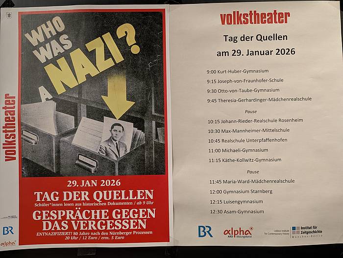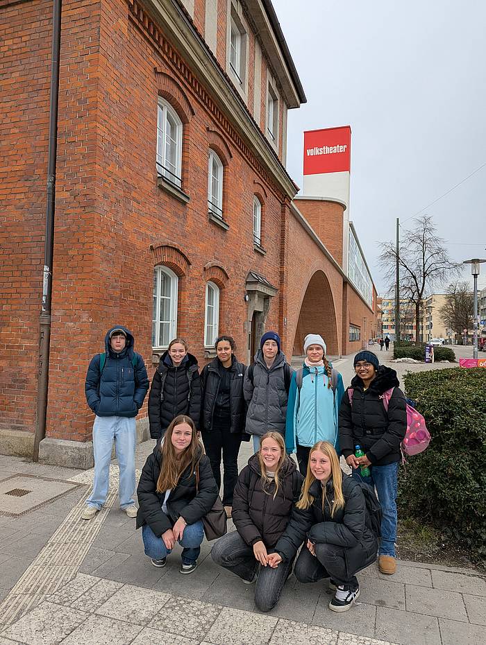 Zum „Tag der Quellen“ am 29.01.2026 trafen sich, wie seit dreizehn Jahren, einige Schülerinnen und Schüler aus verschiedenen Schulen im Volkstheater, um in vielfältiger und kreativer Form historische Quellen aus der NS-Zeit lebendig werden zu lassen. Charvitha Poonuru, Freya Rühlemann, Johanna Kastenberger, Johanna Schröder, Laura Kubinke, Leopold Otto, Luisa Nave, Marvin Lehner und Raja Abade vertraten die Realschule Unterpfaffenhofen und stellten das Leben des Arztes Fritz Hintermayer vor. Fritz Hintermayer ist der Großonkel unserer Lehrerin Frau Helf, wodurch auf eine Reihe von Originaltexten, Fotos und Gerichtsakten zugegriffen werden konnte. So lasen wir Schülerinnen und Schüler abwechselnd zum Beispiel aus seiner selbstverfassten Biografie auf der Bühne des Theaters vor.