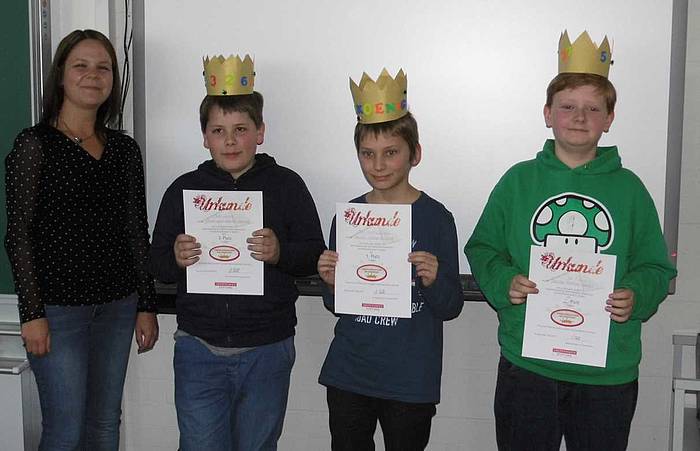 Während die 42 Zahlenjongleure die Vorrunde absolvierten, nahmen die Lehrkräfte an einer Fortbildung zum Landeswettbewerb Mathematik von Frau Barbara Götz teil. Die besten 21 Mathe-Asse kamen schließlich in die Endrunde, die anderen 21 Schülerinnen und Schüler besuchten ein Schnupperseminar im IT-Raum. Am Ende der gelungenen Veranstaltung standen drei Sieger fest: