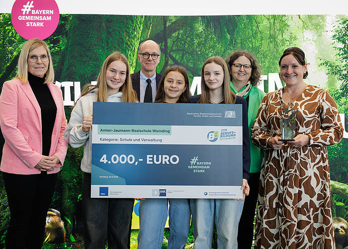 Bei der Preisverleihung in Nürnberg von links nach rechts Konrektorin Sandra Lüftl, Clara Schneid, Dr. Markus Gruber, Greta Wagner, Valerie Städele, Schulleiterin Alexandra Waschner-Probst und für das Team...
