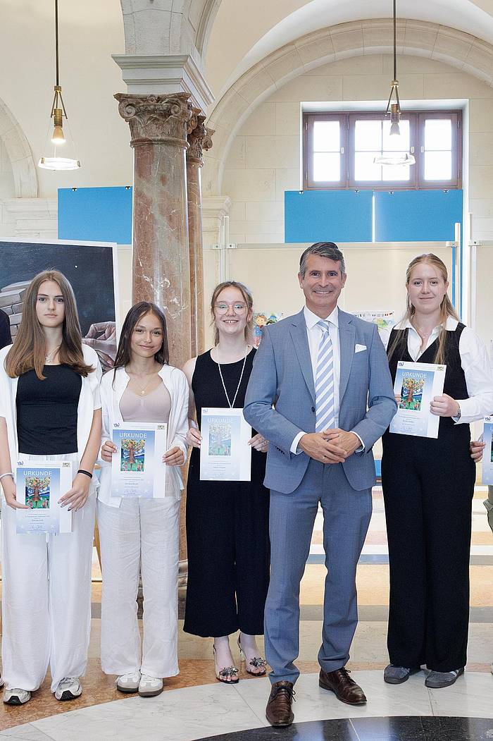 Die Schülerinnen der Klasse 9c, der Realschule St. Ursula Augsburg, wurden im Rahmen einer feierlichen Preisverleihung in der Staatskanzlei München ausgezeichnet. Sie haben mit ihrem Musikvideo „Stop the Hate“ in der Kategorie „Pop gegen Populismus“ einen Bundespreis des Europäischen Wettbewerbs erhalten. Der Staatsminister für Europaangelegenheiten, Herr Eric Beißwenger, überreichte persönlich die Urkunden und würdigte das große Engagement und die kreativen Leistungen der Schülerinnen. Der Bundespreis zählt zu den höchsten Auszeichnungen im Wettbewerb, an dem in diesem Jahr über 74.000 Schüler teilnahmen. Die Auszeichnung ist eine besondere Anerkennung für das europäische Denken und die gestalterische Kraft unserer Schülerinnen. Wir sind stolz auf diesen großartigen Erfolg!