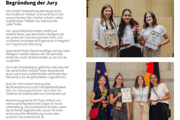 Vertreterinnen der Schülerzeitung der Maria-Ward-Realschule in Mindelheim waren vom 24. bis 26. Juni 2025 in Berlin, um im Bundesrat die Auszeichnung der “Idee” als beste Schülerzeitung Deutschlands in der Kategorie “Realschule” entgegenzunehmen.