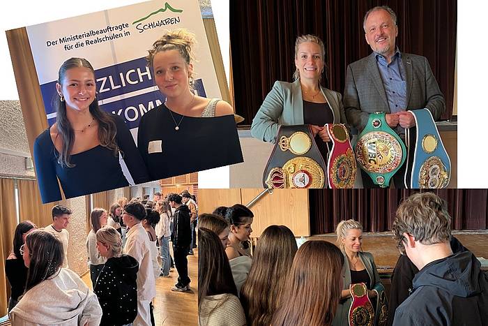 Ein besonderes Highlight war der Besuch der vierfachen Box-Weltmeisterin Tiny Tina Rupprecht, die in einem kurzweiligen und interessanten Vortrag von ihrer Karriere als Boxerin berichtete. Es war spannend zu sehen, mit welchen Herausforderungen sie während ihrer aktiven Zeit konfrontiert war und wie wichtig ihr Werte wie Durchhaltevermögen, Entschlossenheit, Respekt und Mut – nicht nur um Boxsport – sind. Die Schülersprecherinnen und Schülersprecher stellten im Anschluss viele Fragen und nutzten die Gelegenheit, um sich die Gürtel der vier Weltmeistertitel von Tiny Tina anzuschauen. Natürlich wurden auch fleißig Fotos gemacht und Autogrammkarten ausgegeben.