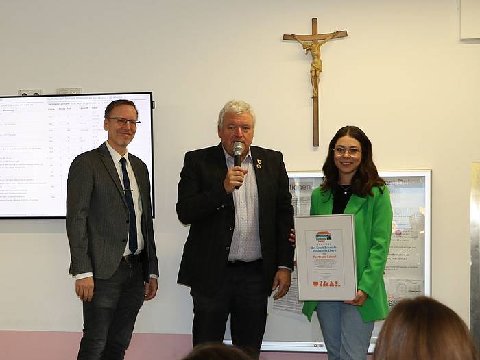 Stellvertretend für die Schulgemeinschaft der Dr.-Ernst-Schmidt-Realschule nimmt Fairtrade-Koordinatorin Adriane Winkler die Urkunde zur Rezertifizierung als Fairtrade-Schule von Bürgermeister Jürgen Hennemann in Empfang. Links im Bild Schulleiter Hartmut Weis (Foto: Uli Hönig).