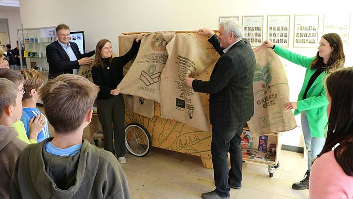 v. l. n. r.: Konrektor Markus Teuber, Koordinatorin für kommunale Entwicklungspolitik der Baunach-Allianz e. V. Frau Maren Lorenzen-Fischer, Bürgermeister Jürgen Hennemann und Fairtrade-Koordinatorin Adriane Winkler bei der Eröffnung der Wanderausstellung „fair unterwegs“ (Foto: Uli Hönig).
