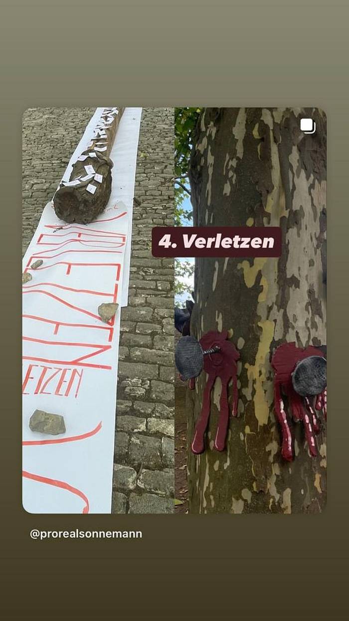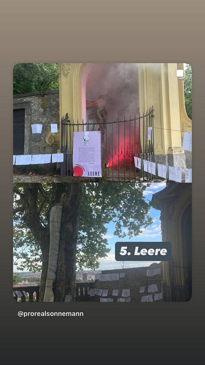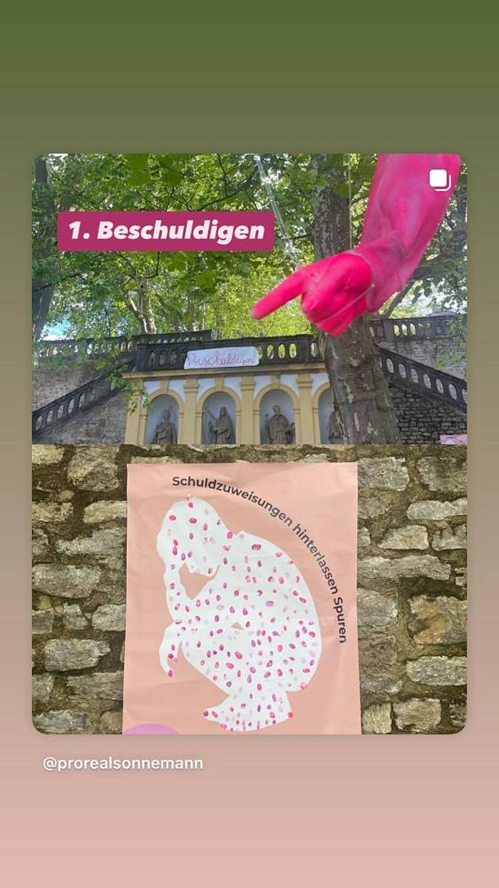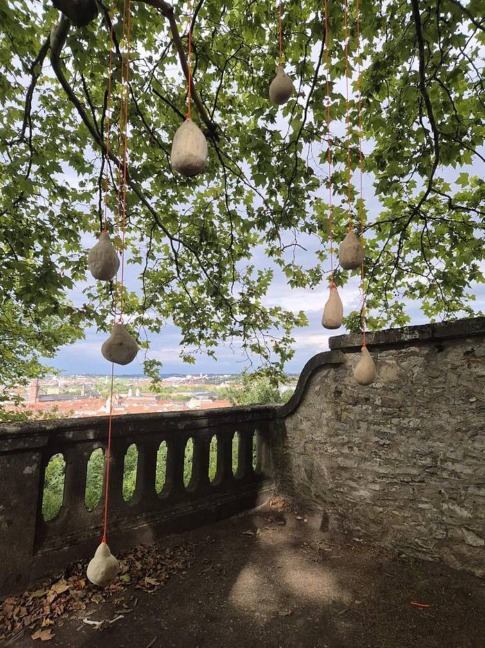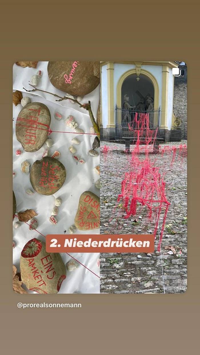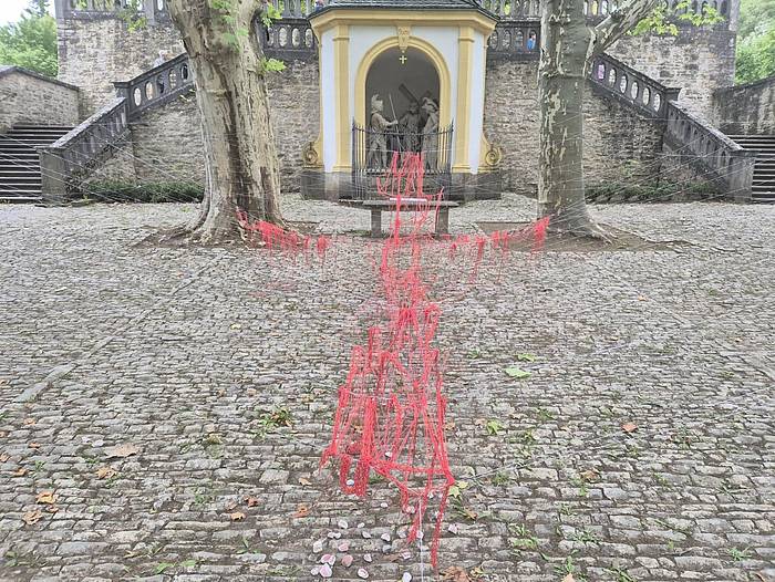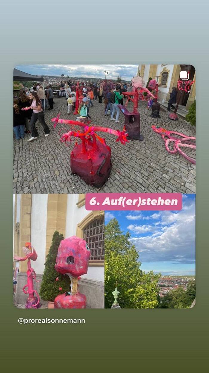 Bereits beim Betreten des Stationenwegs wurden die Gäste von eindrucksvollen Kunstwerken und Installationen empfangen. Entlang des Wegs hinauf zum Käppele konnten sie von Plateau zu Plateau steigen – jedes einem eigenen Thema gewidmet, das den Leidensweg Jesu mit der heutigen Lebenswelt verknüpft. Beschuldigung, Niederdrücken, Nachdenken, Verletzungen, Leere – jede Station lud zum Innehalten, Mitmachen und Nachdenken ein. Eine Broschüre, in die kleine Zeichnungen eingeklebt werden konnten, leitete die Besucherinnen und Besucher durch die Ausstellung.