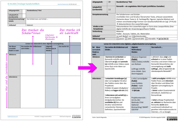 Je nach Fach sind zu den illustrierenden Musterstunden in einem Strukturkopf zusätzlich Informationen zur Jahrgangsstufe, zum Lehrplanbezug, zu den zu erwartenden Kompetenzen wie auch Angaben zur durchschnittlichen Dauer und zu den benötigten Materialen, Apps etc. angegeben. Zuletzt gibt es für Lehrkräfte zur Reflexion eine kurze Einschätzmöglichkeit zur Umsetzung der Stunde.